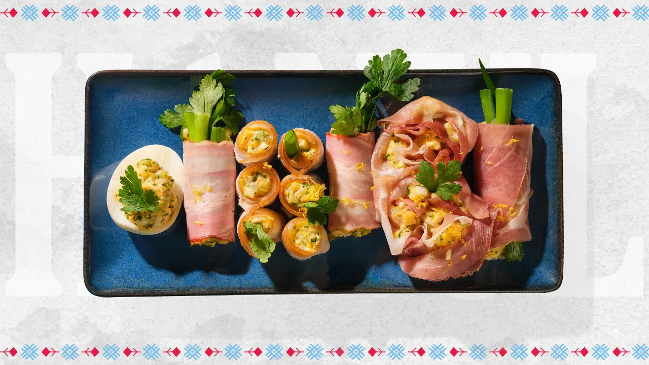 În feliile de slănină / bacon / prosciutto se adaugă câte un fir de ceapă verde și/sau câte un fir de pătrunjel, se pune umplutura obținută și se rulează astfel încât să se formeze niște buchețele de primăvară. Se rade puțină coajă de lămâie și gata!
