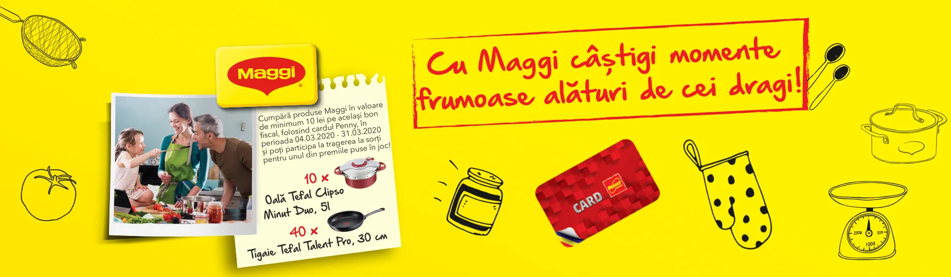 Cumpără produse Maggi în valoare de minimum 10 lei pe același bon fiscal, folosind cardul Penny, în perioada 04.03.2020 - 31.03.2020 și poți participa la tragerea la sorți pentru unul din premiile puse în joc!