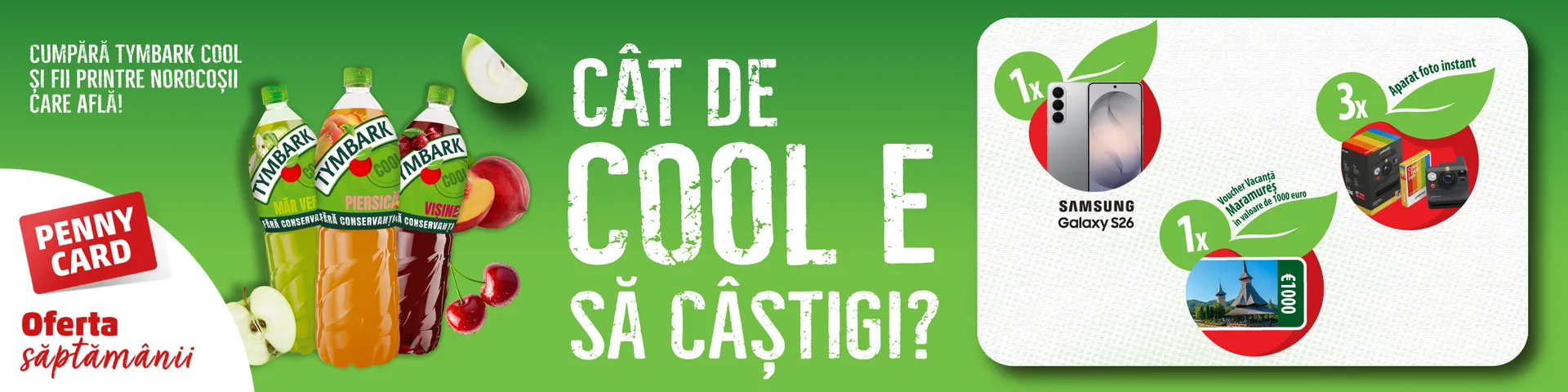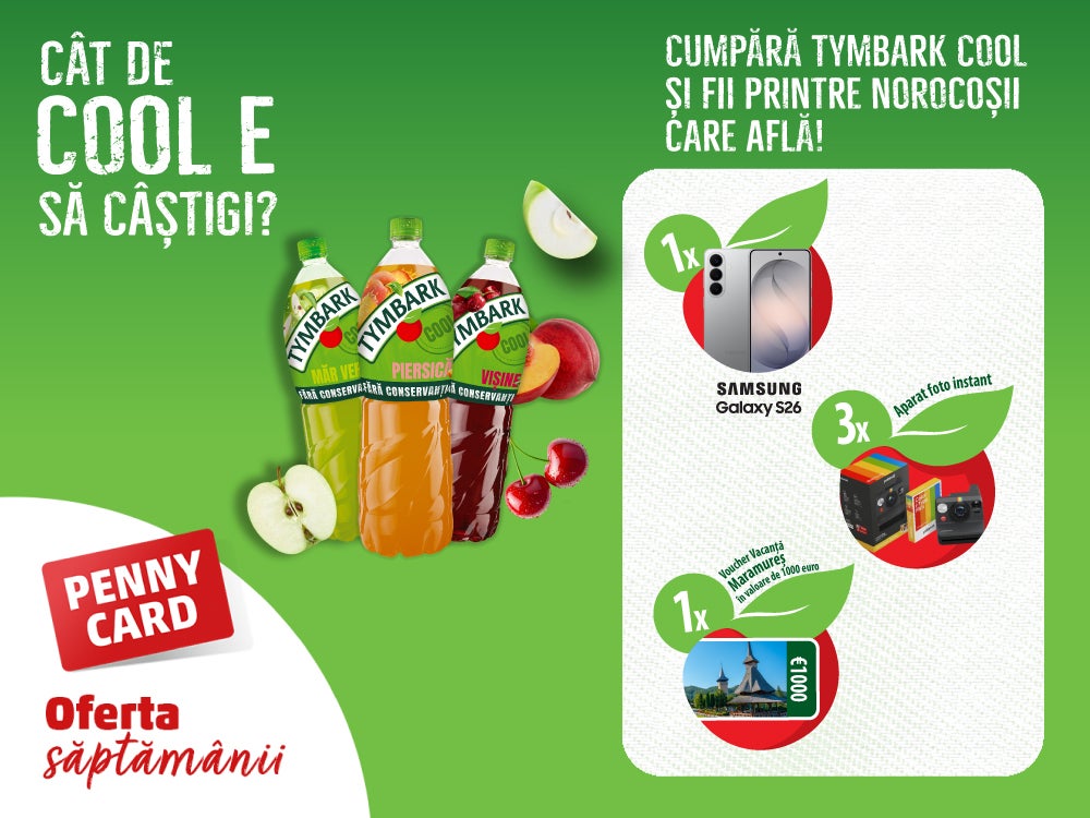 Alege minimum 2 produse Tymbark Cool în perioada 06.04 - 31.05.2026, scanează PENNY Card și poți câștiga premii pe măsură: un Samsung Galaxy S26, un voucher pentru vacanță sau unul dintre cele 3 aparate foto instant. Participă acum!