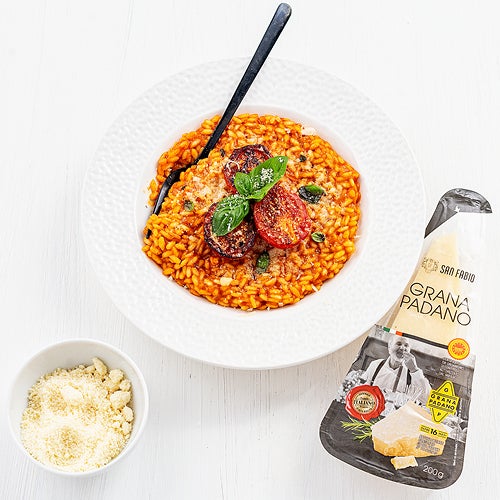 Încingi uleiul într-o cratiță, la foc mediu, adaugi untul și îl lași până se topește. Pui ceapa și o sotezi până devine translucidă. Adaugi orezul, micșorezi flacăra și îl lași 2-3 minute, amestecând continuu, până se înmoaie ușor. Pui roșiile pasate, amesteci, acoperi vasul și lași 2 minute. Torni apoi supa de legume, acoperi din nou și lași să fiarbă maximum 20 de minute (sau cât scrie pe ambalaj), până scade lichidul. Potrivești de sare și piper, adaugi parmezanul ras și verdeața, amesteci și oprești focul. Servești imediat.