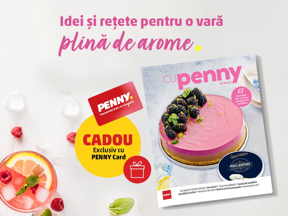 Scanează PENNY Card la cumpărături în perioada 02.07.2025 - 12.08.2025 și primești revista Cu PENNY la masă cadou!