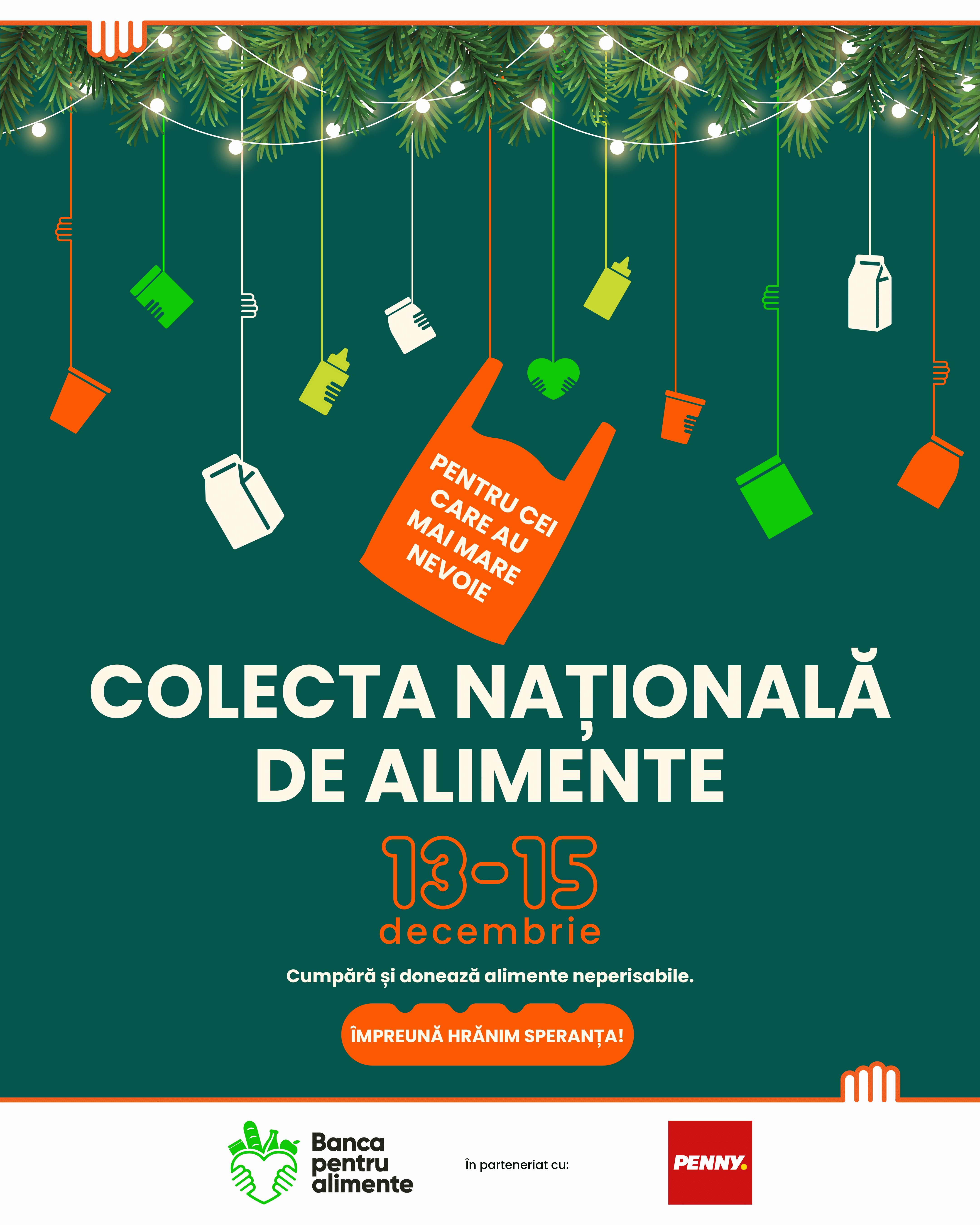 Ediția de Crăciun a Colectei Naționale de Alimente face un apel la solidaritate, invitând clienții magazinelor partenere – inclusiv PENNY | REWE România – să sprijine concret persoanele aflate în dificultate. Oamenii sunt încurajați să achiziționeze produse alimentare neperisabile, precum conserve, paste, orez, zahăr, ulei, făină, cereale, dulciuri sau alimente pentru copii, să le așeze în punga portocalie, simbol al speranței, și să le depună în spațiile special amenajate, amplasate după casele de marcat.