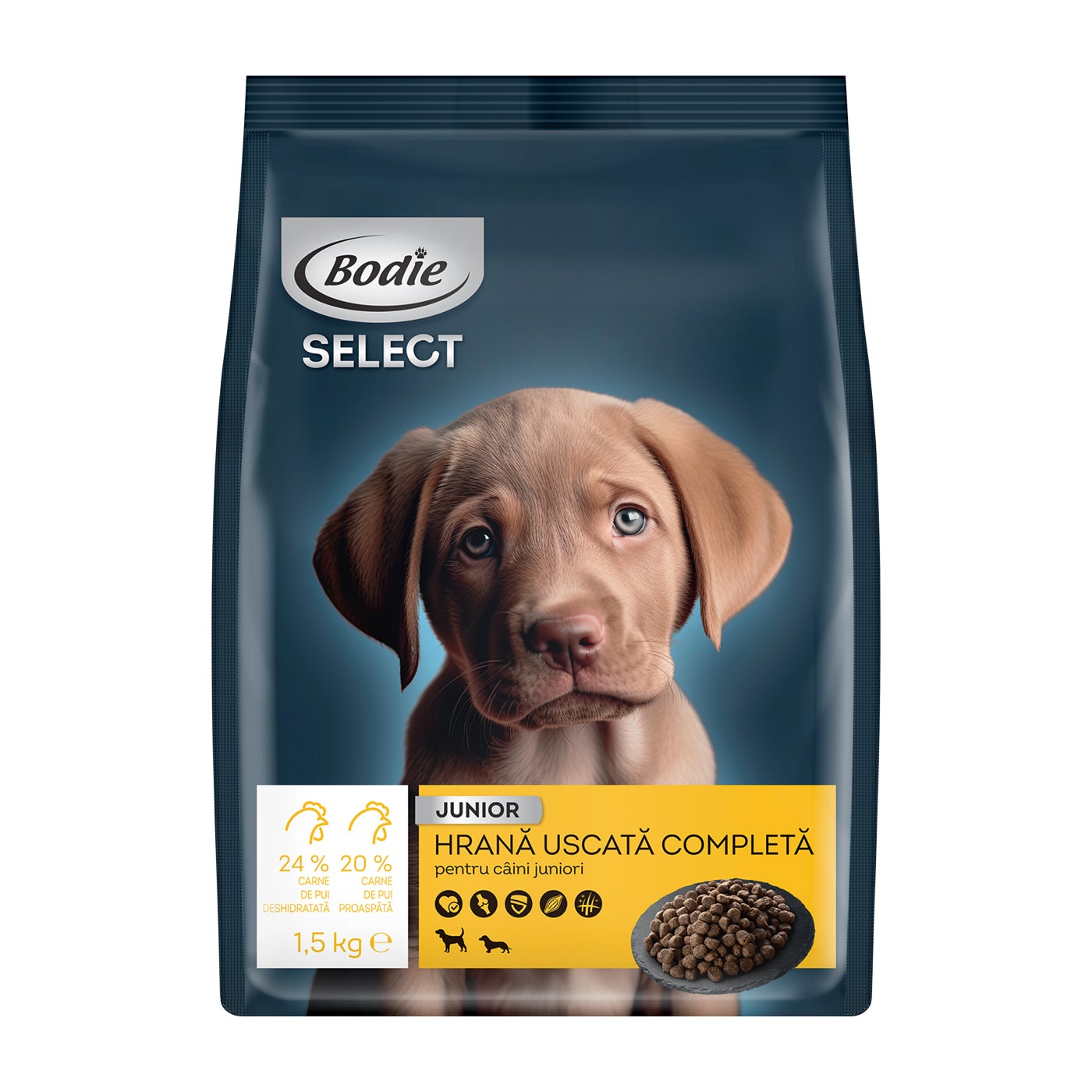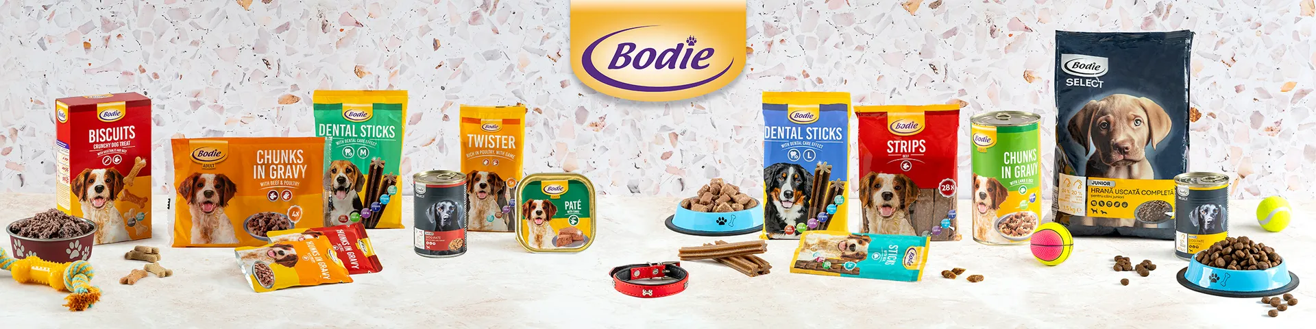Bodie este hrana ce asigură aportul nutrițional necesar pentru prietenii noștri blănoși. Alege sortimentul potrivit pentru vârsta și statura câinelui tău dintr-o gamă variată, de care să nu se plictisească prea curând. Fie că optezi pentru hrană uscată, umedă sau pentru snack-uri din carne de vită sau pasăre, știi că îi oferi îngrijirea și atenția de care are nevoie. Produsele Bodie reunesc ingrediente de calitate, atent selecționate, în pachete și conserve care vor completa perfect dieta câinelui tău.
