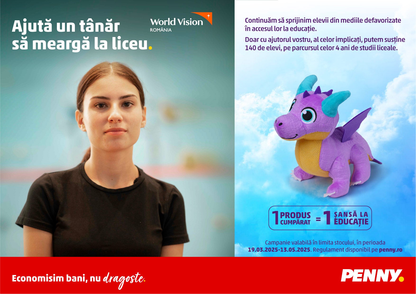 Prin intermediul acestei campanii, PENNY continuă, alături de World Vision România, să susțină cauza „Vreau în clasa a 9-a”, program prin care zeci de elevi sunt ajutați să acceseze programe educaționale, stimulându-le interesul pentru continuarea studiilor. Cu ajutorul celor implicați, PENNY poate susține în continuare cei 140 de elevi din Vaslui, Brăila, Cluj, Bistrița Năsăud, Iași, Vâlcea, Buzău, Bacău, Dolj, Ilfov, pe parcursul celor 4 ani de studii liceale.
