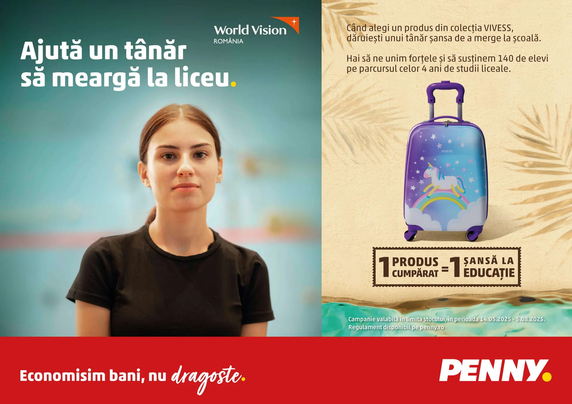 - Clienții se pot implica prin intermediul campaniei de loializare „Vacanțele de neuitat încep cu noua colecție Vivess.” – fiecare produs Vivess cumpărat sprijină cauza „Vreau în clasa a 9-a”, dezvoltată de World Vision România în parteneriat cu PENNY.