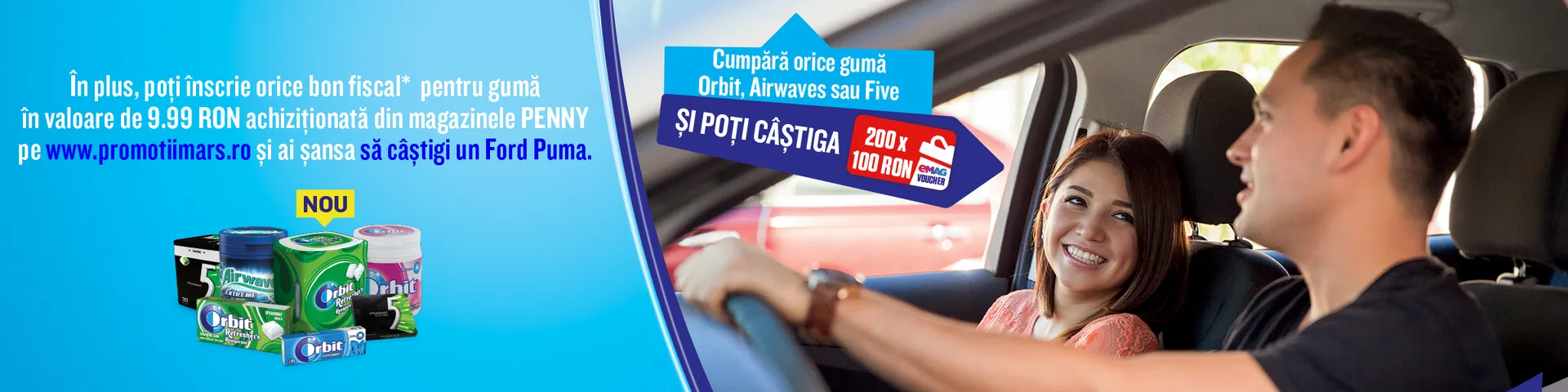 În plus, poţi înscrie orice bon fiscal pentru gumă în valoare de 9.99 RON achiziţionată din magazinele PENNY pe www.promotiimars.ro și ai șansa să câștigi un Ford Puma.