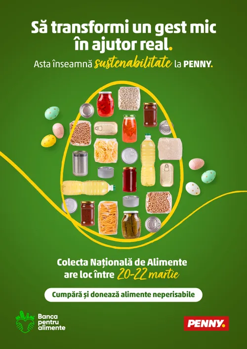 În perioada 20–22 martie, toate magazinele PENNY România din întreaga țară se alătură Colectei Naționale de Alimente, organizată de Federația Băncilor pentru Alimente din România (FBAR) – o campanie națională de solidaritate, desfășurată la nivelul întregii rețele.
