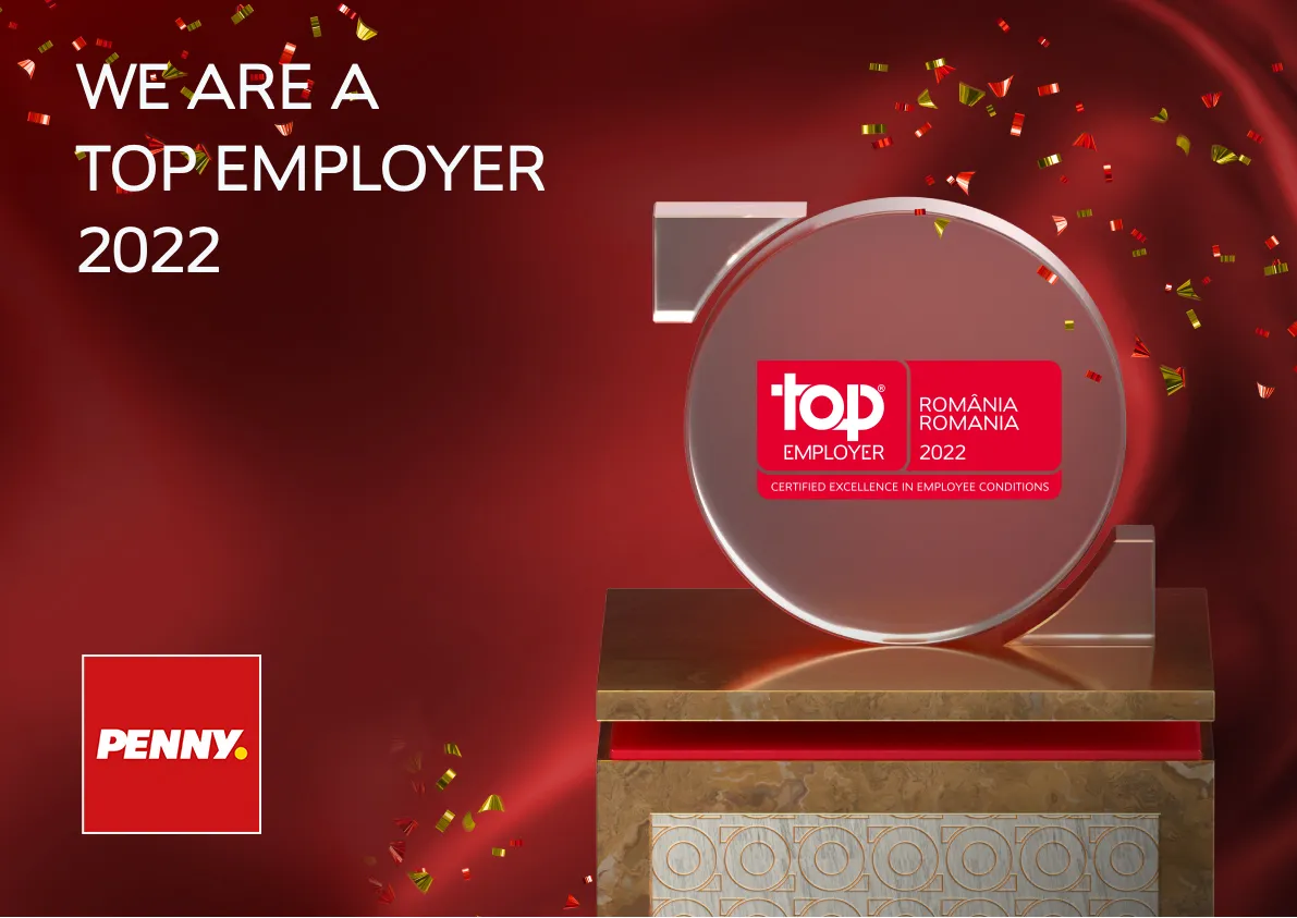 PENNY se află printre organizațiile de top care au primit titulatura de Angajator de Top (Top Employer) 2022 în România. Certificarea de Angajator de Top reflectă grija și angajamentul pentru echipă și performanțele în practicile de resurse umane.