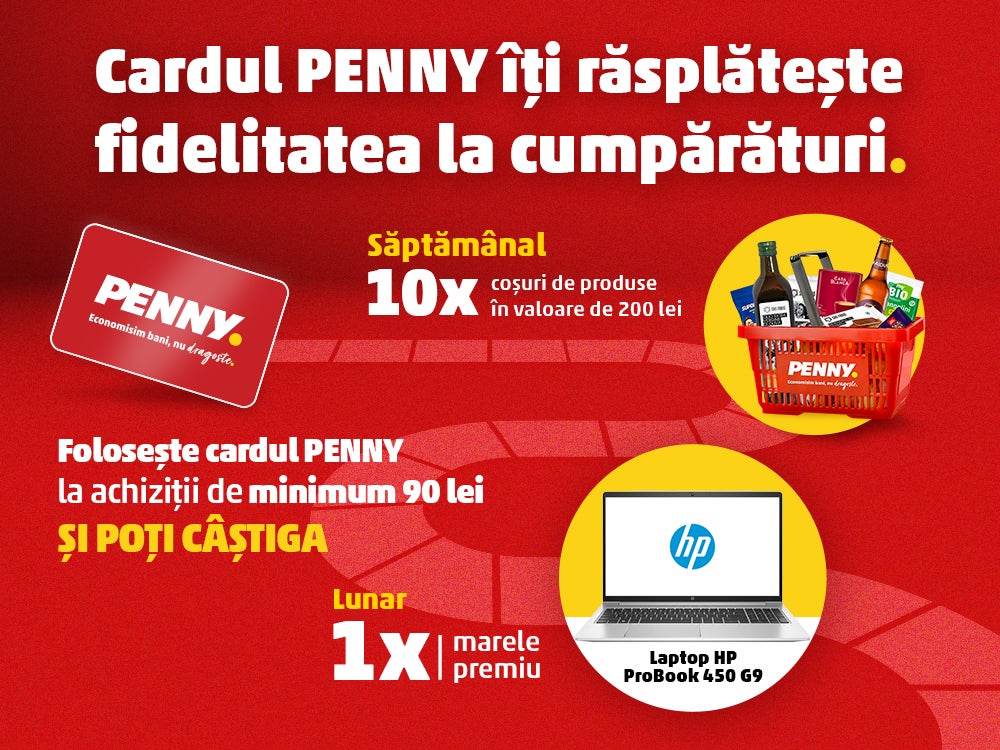 Folosește cardul PENNY la achiziții de minim 90 de lei în magazine și poți câștiga săptămânal un coș cu produse în valoare de 200 de lei, iar lunar unul din marile premii. Nu uita să scanezi cardul de fidelitate la casă la fiecare vizită și ești înscris automat în campanie.