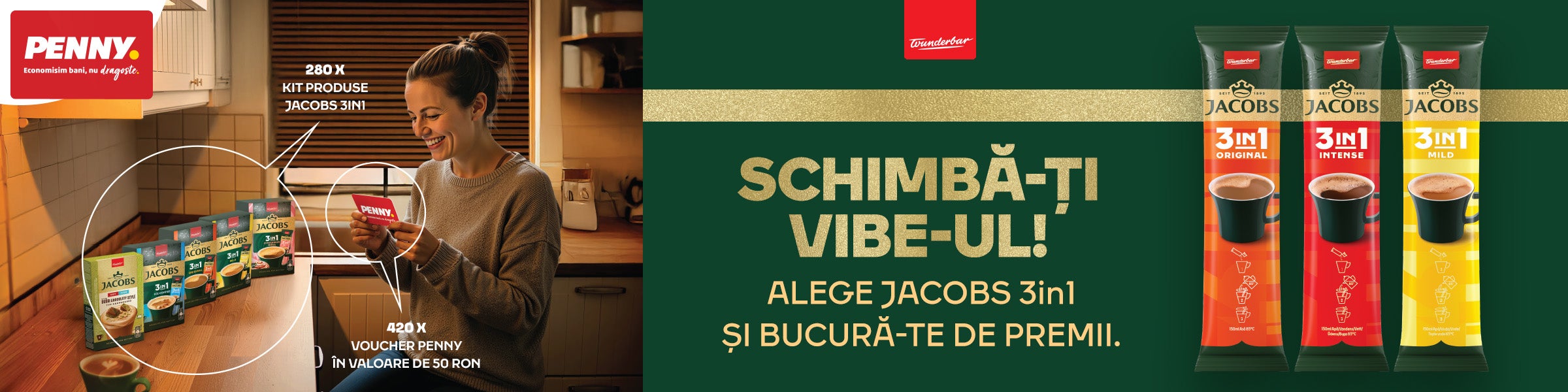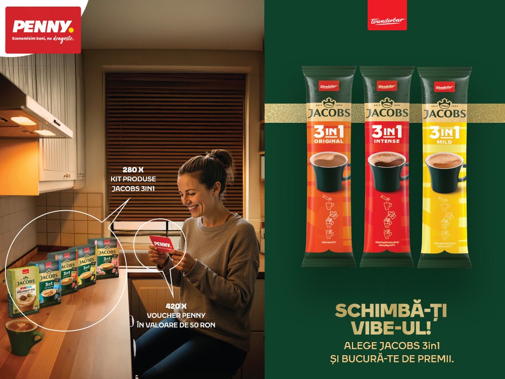 Cumpără Jacobs 3in1 de minimum 15 lei cu PENNY Card și poți câștiga 200 de kituri Jacobs 3in1 sau unul dintre cele 420 de vouchere PENNY de 50 lei.